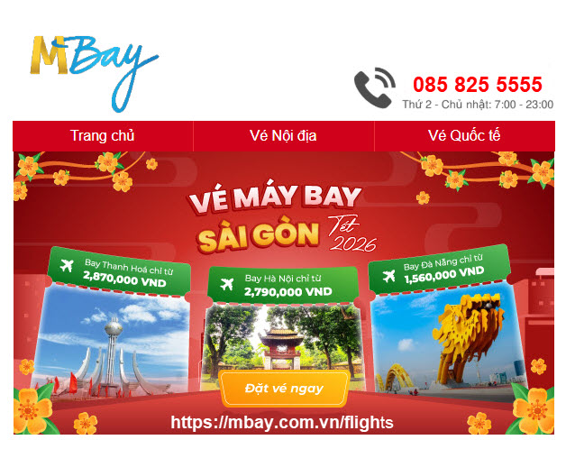 Để săn vé máy bay Tết 2026 giá rẻ, quý khách vui lòng tham khảo trên website MBAY hoặc gọi tới tổng đài 0858255555 để được tư vấn trực tiếp!